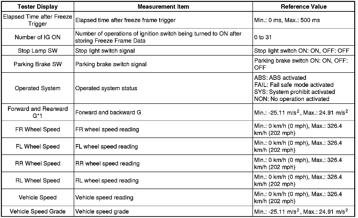 * Freeze Frame Data at the time the ABS operates: