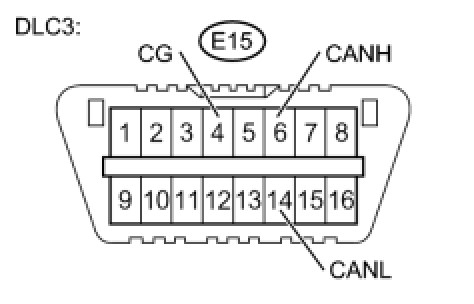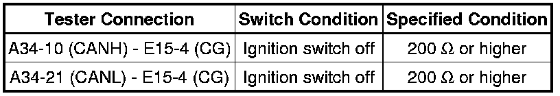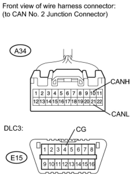 There may be a short circuit between the CAN bus line and GND when there is no resistance between terminals 6 (CANH) and 4 (CG) or terminals 14 (CANL) and 4 (CG) of the DLC3.