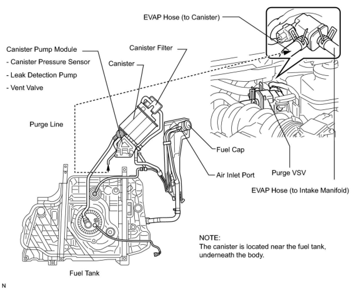 The leak detection pump creates negative pressure (vacuum) in the EVAP system and the pressure is measured. Finally, the ECM monitors for leaks from the EVAP system, and malfunctions in both the canister pump module and purge VSV, based on the EVAP pressure.
