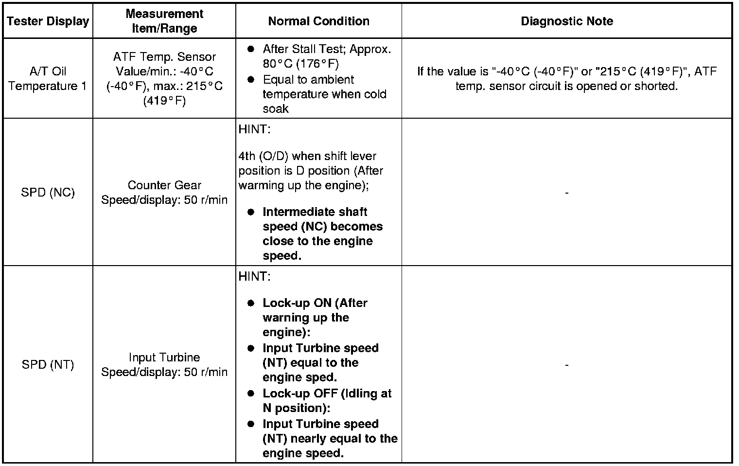 In the table below, the values listed under "Normal Condition" are reference values. Do not depend solely on these reference values when deciding whether a part is faulty or not.