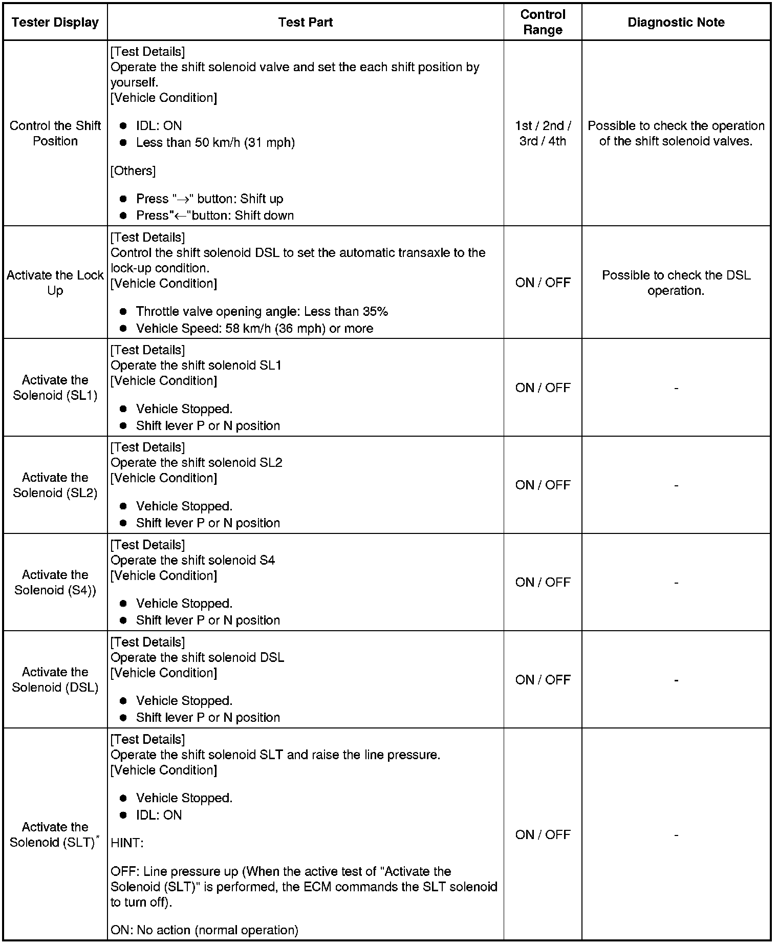 (h) *: "Activate the Solenoid (SLT)" in the Active Test is performed to check the line pressure changes by connecting the SST to the automatic transaxle, which is used in the HYDRAULIC TEST Hydraulic Test as well.