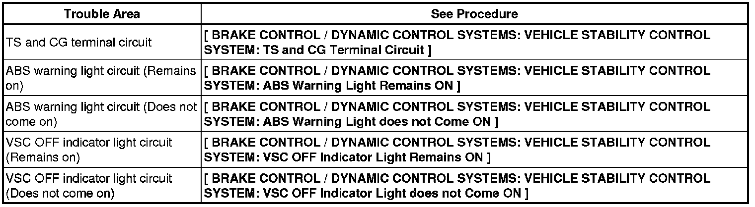 * If the ABS warning and VSC OFF indicator lights do not blink, inspect the TS and CG terminal circuit and ABS warning and VSC OFF indicator light circuits.