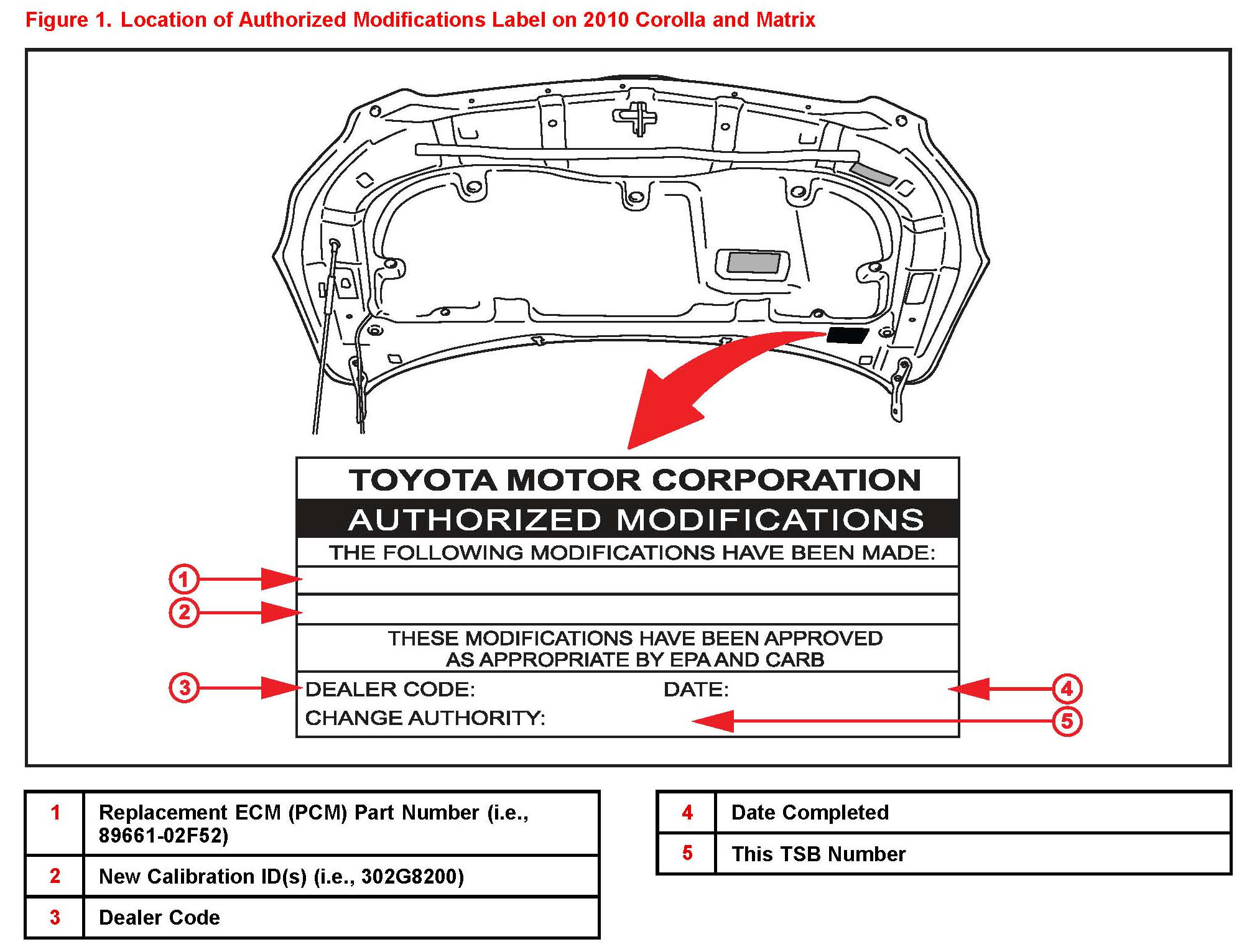 3. Check for the Authorized Modifications Label affixed to the vehicle in the location shown in Figure 1. Confirm if the ECM (PCM) calibration has been updated. If the calibration ID listed is NOT the latest ECM (PCM) calibration - go to step 4.