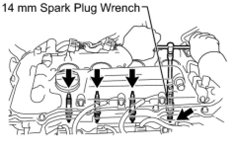 (a) Using a 14 mm spark plug wrench, install the 4 spark plugs.