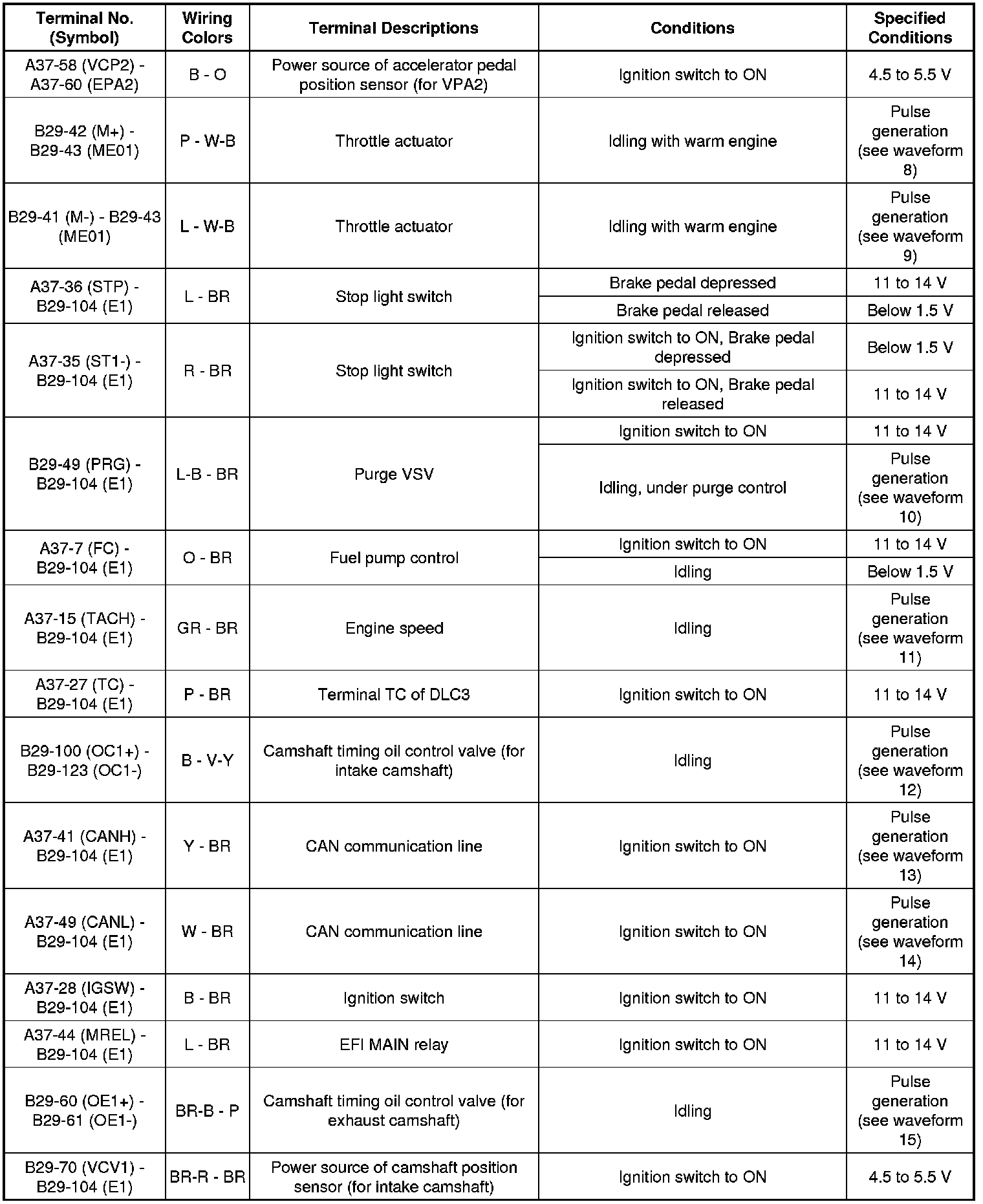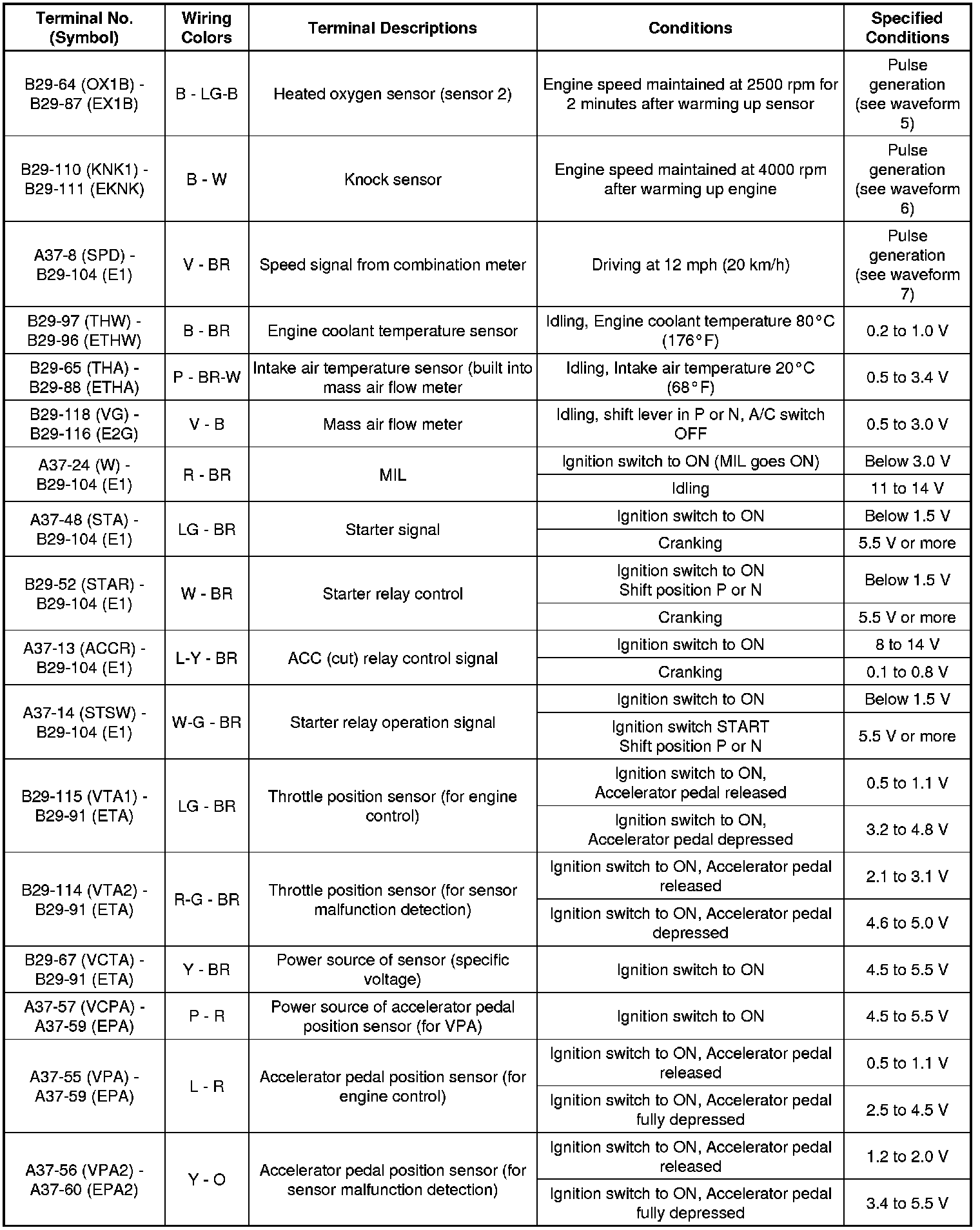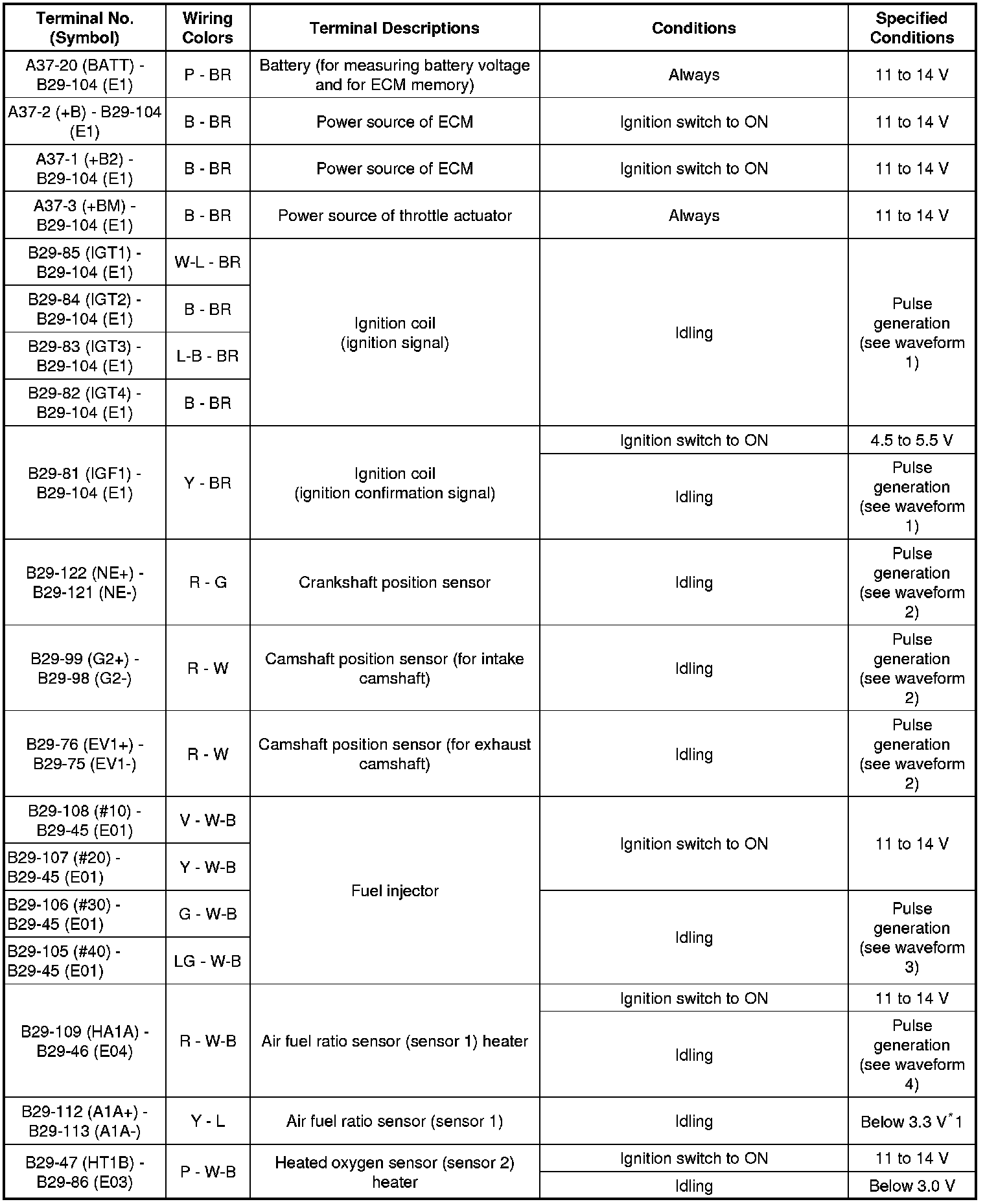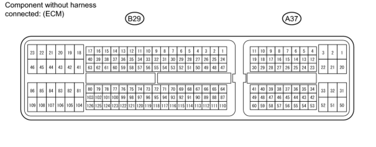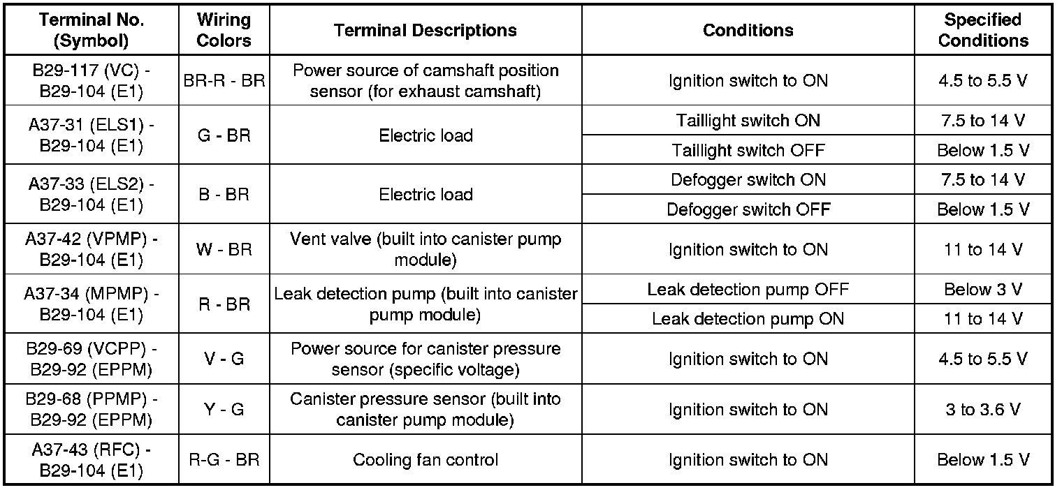 The standard normal voltage between each pair of the ECM terminals is shown in the table below. The appropriate conditions for checking each pair of the terminals are also indicated. The result of checks should be compared with the standard normal voltage for that pair of the terminals, and displayed in the "Specified Conditions" column. The illustration above can be used as a reference to identify the ECM terminal locations.