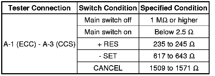 If the result is not as specified, replace the cruise control main switch.