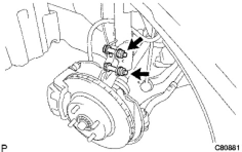 (d) Remove the 2 nuts on the lower side of the front shock absorber.