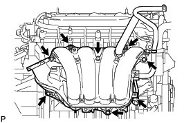 (d) Remove the 5 bolts, 2 nuts and intake manifold.