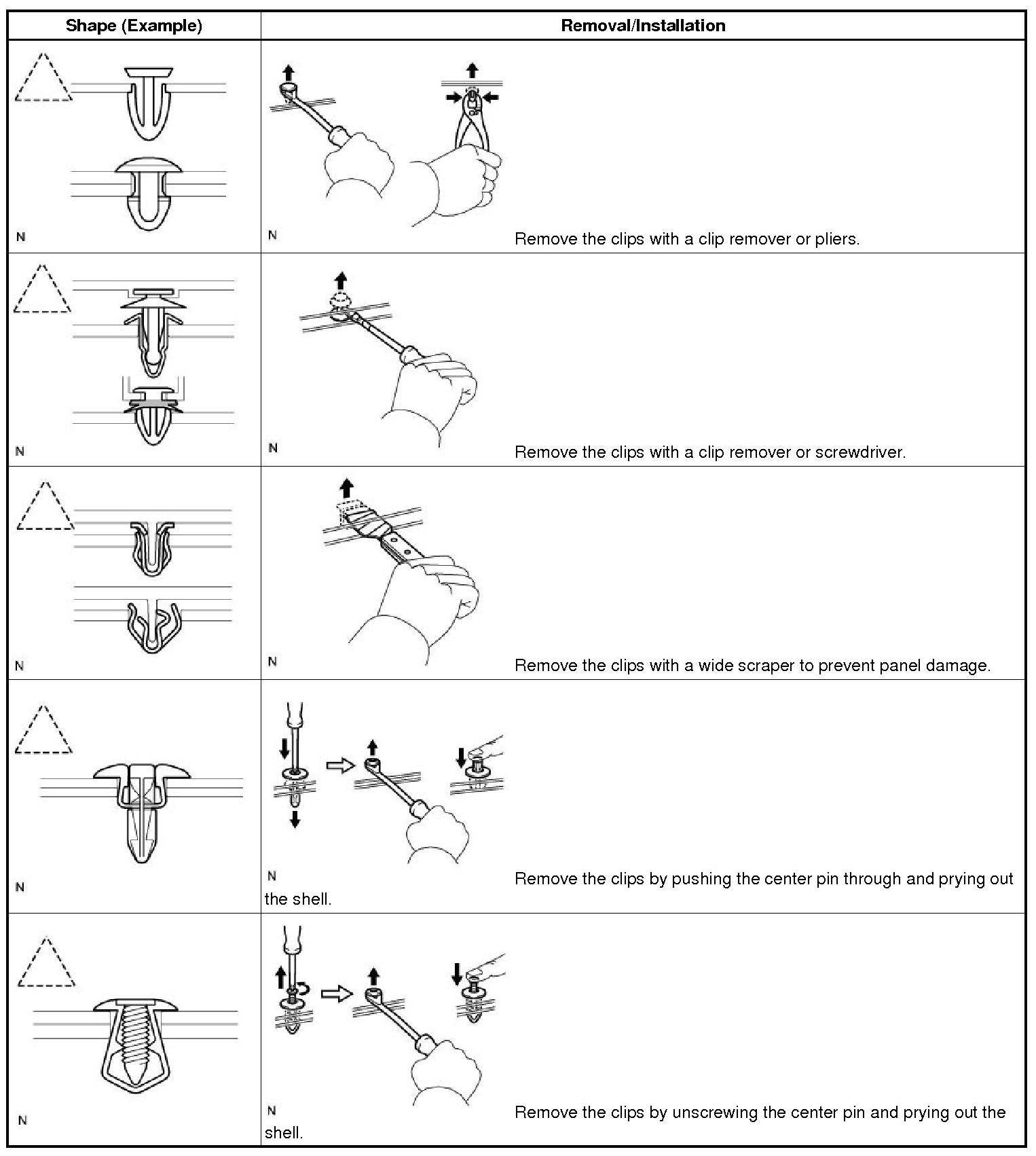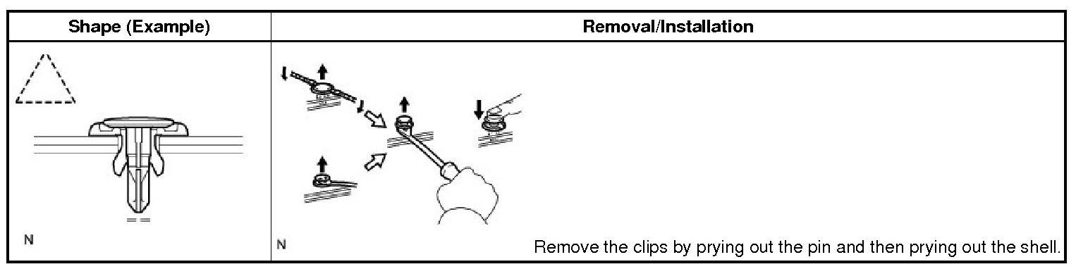 (1) The removal and installation methods of typical clips used for vehicle body parts are shown in the following table.