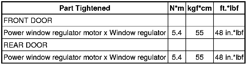 SPECIFICATIONS: WINDOW / GLASS: TORQUE SPECIFICATIONS