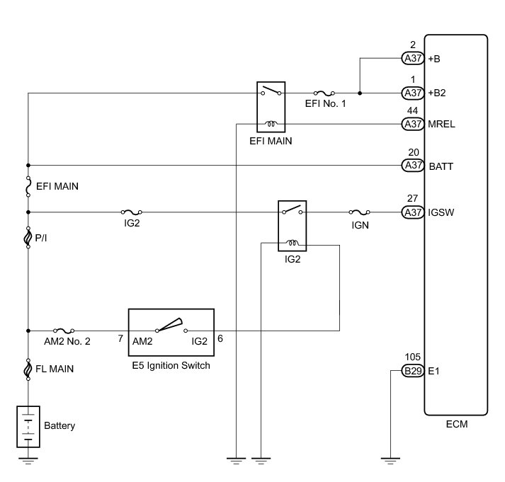 When the ignition switch is turned to the ON, battery voltage is applied to IGSW of the ECM. The output signal from the MREL terminal of the ECM causes a current to flow to the coil, closing the contacts of the integration relay (EFI MAIN relay) and supplying power to either terminal +B and +B2 of the ECM.