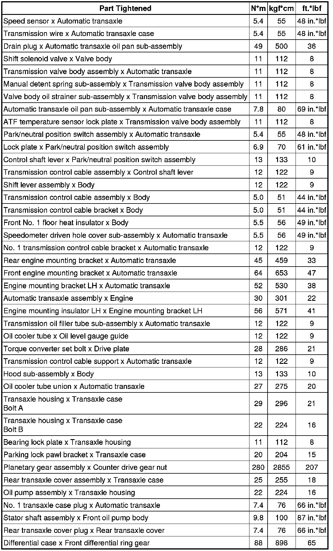 SPECIFICATIONS: U341E AUTOMATIC TRANSMISSION / TRANSAXLE: TORQUE SPECIFICATIONS