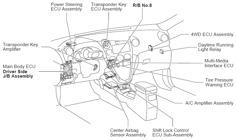 Fig 2: Driver Side J/B Assembly Main Body ECU & Connector Locations