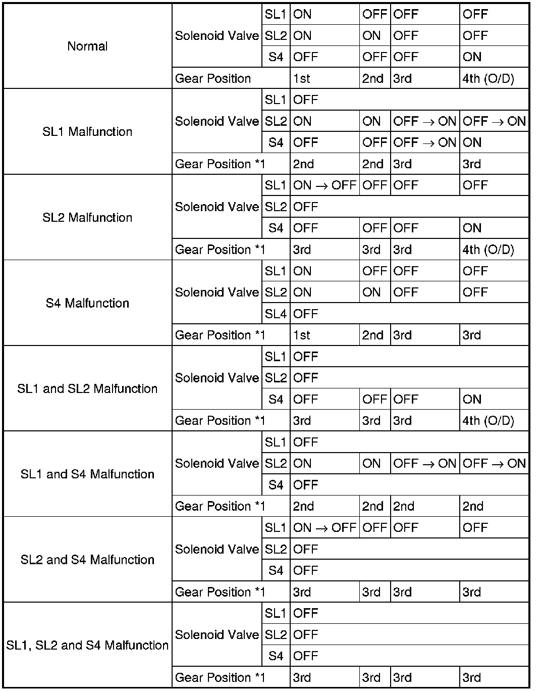 If either of the shift solenoid valve circuits develops an open or short, the ECM turns the other shift solenoid "ON" and "OFF" in order to shift into the gear positions shown in the table below.