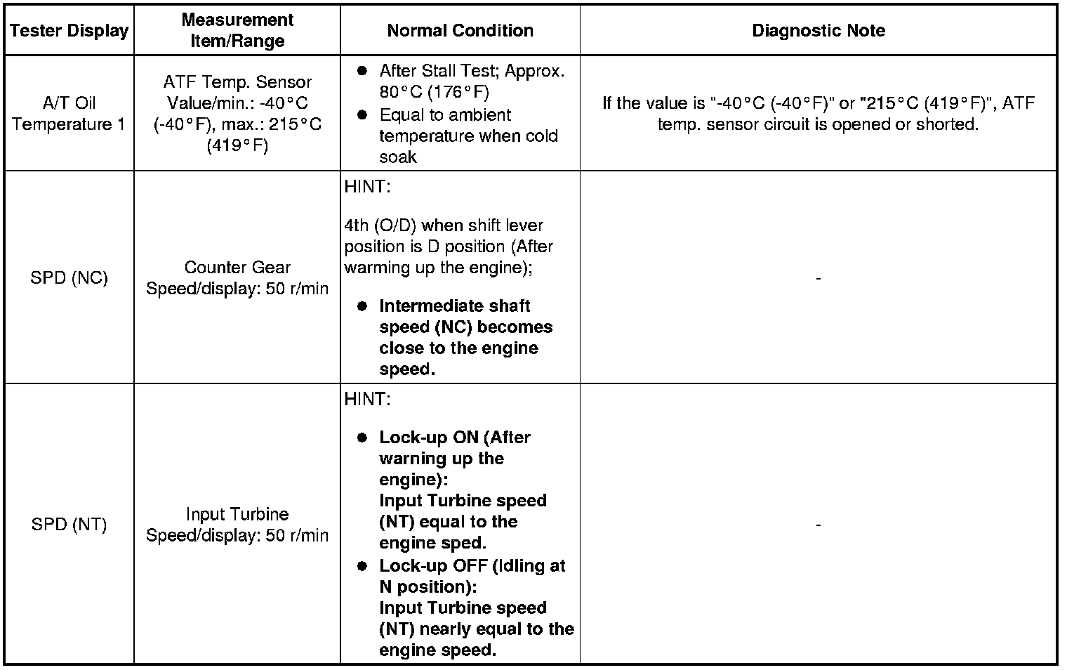 In the table below, the values listed under "Normal Condition" are reference values. Do not depend solely on these reference values when deciding whether a part is faulty or not.