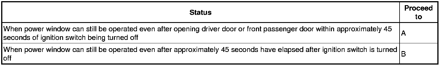 * When the driver door has not been opened and fully closed, each door power window regulator motor can control its power window operation for approximately 45 seconds after the ignition switch is turned from the ON position to off (the key is removed) by receiving operation permission signals from the main body ECU. However, when approximately 45 seconds have elapsed, or the driver door or front passenger side door is opened within approximately 45 seconds of the ignition switch being turned off (the key is removed), the power window regulator motor stops operating.