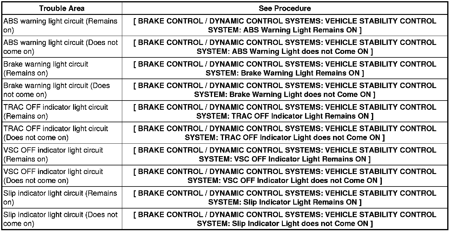 * If any of the indicators remains on or does not come on, proceed to troubleshooting for the light circuits listed below.