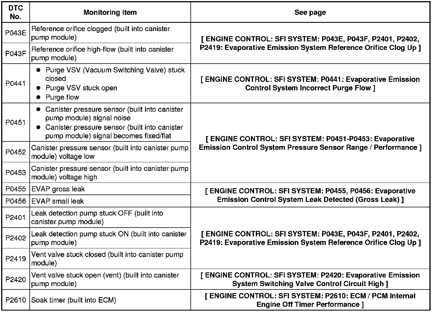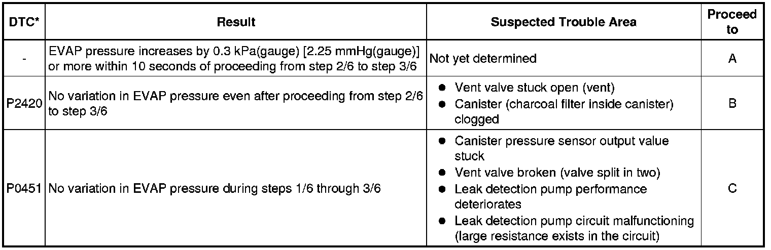 If any EVAP system DTCs are stored, the malfunctioning area can be determined using the table below.