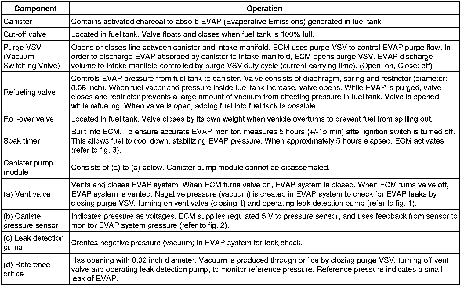 The leak detection pump creates negative pressure (vacuum) in the EVAP system and the pressure is measured. Finally, the ECM monitors for leaks from the EVAP system, and malfunctions in both the canister pump module and purge VSV based on the EVAP pressure.