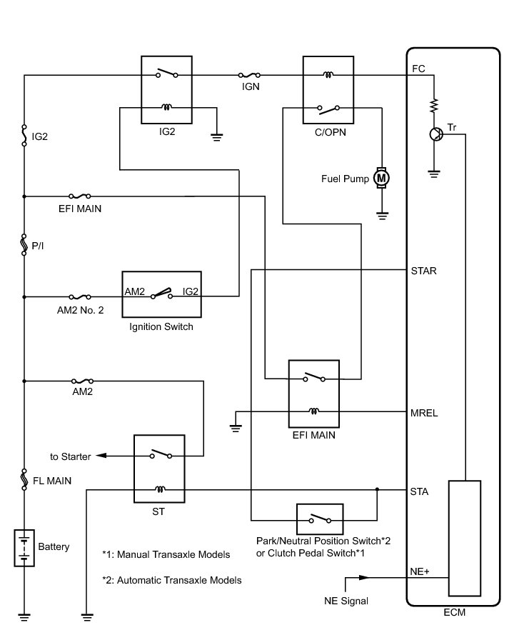 In the diagram below, when the engine is cranked, the starter relay drive signal output from the STAR terminal of the ECM is input to the STA terminal of the ECM, and NE signal generated by the crankshaft position sensor is also input to the NE+ terminal.