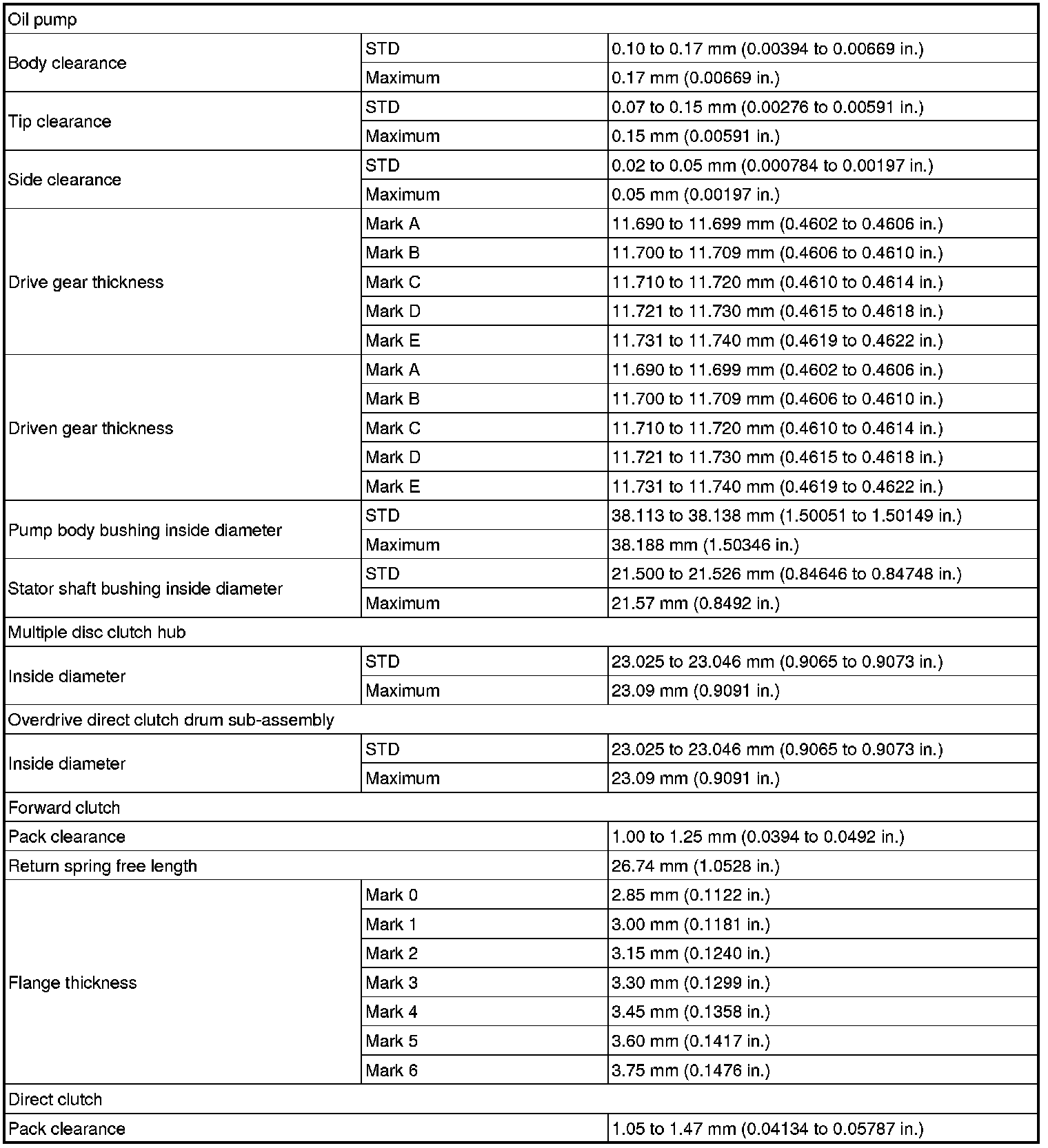 SPECIFICATIONS: U250E AUTOMATIC TRANSMISSION / TRANSAXLE: SERVICE DATA