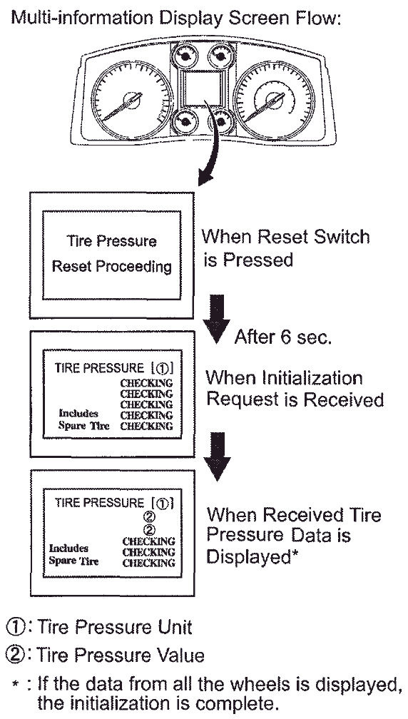 If initialization is performed, the existing tire positions will be cleared, but will be automatically identified when the vehicle is driven at 40 km/h (25 mph) or more for 10 minutes or more.
