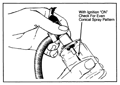 5. Operate fuel pump. Turn switch to "ON" position. Cold start injector should spray. Turn switch "OFF", but leave fuel pump running. Injector should not spray. Wipe off nozzle and check for leakage. With pump running, no drops should form within one minute.