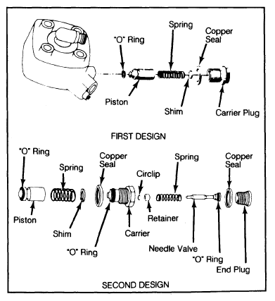 4. Loosen line pressure regulator nut. Remove shims, spring(s) and plunger. Raise system pressure by adding shims; lower pressure by removing shims. Be sure "O" rings are in good condition. If piston is scored or damaged, fuel distributor must be replaced. See Fig 1.