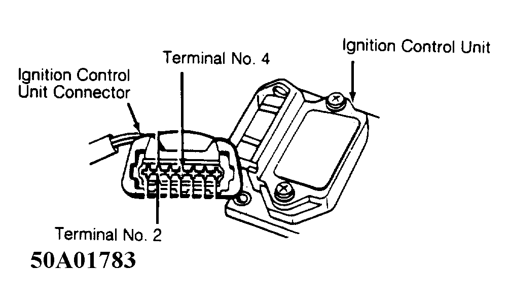 2. Voltage should be present. If not, ensure continuity exists between terminal No. 2 and ground. Continuity must also exist between terminal No. 4 and ignition coil positive terminal. Repair wiring if necessary. If wiring is okay, replace ignition control unit.