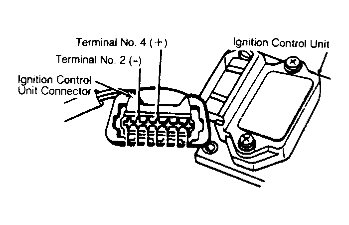 1. Perform SPARK check. If secondary spark is present, ignition control unit is okay. If not, turn ignition off. Disconnect ignition control unit wire harness connector. Turn ignition on. Using a voltmeter, measure voltage between terminal No. 2 (-) and terminal No. 4 (+) of connector. See Fig 1 .