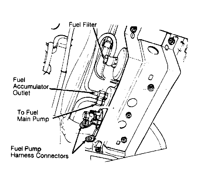 1. Disconnect wire harness connector from the fuel pump. See Figure . With voltmeter attached to terminals, activate fuel pump by removing fuel pump relay and applying battery voltage to terminals No. 4 of the fuse box connection for the fuel pump relay. Fuel pump relay located on fuse box housing. Terminal numbers are molded into fuse box plastic housing.