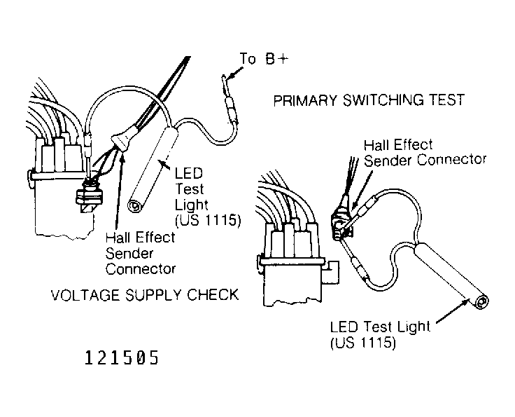 2. If light came on in step 1), reconnect Hall Effect sender harness connector. Pull back Hall Effect sender boot to expose contact terminals. Apply LED Test Light (US 1115) probe to center contact and battery positive terminal. See Fig 1 . Observe test light while cranking engine. If test light blinks, Hall Effect sender is okay. If not, replace Hall Effect sender.
