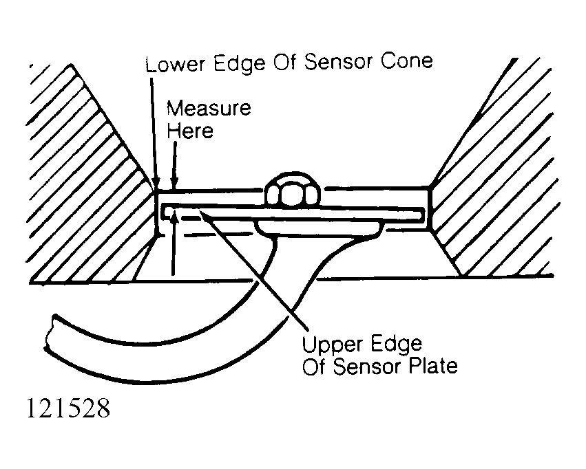 Upper edge of sensor plate must be .070-.080" (1.80-2.10 mm) below lower edge of sensor cone. See Fig 1. If rest position is incorrect, raise sensor plate. Open or close wire clip to change position of sensor plate. DO NOT  bend leaf spring.