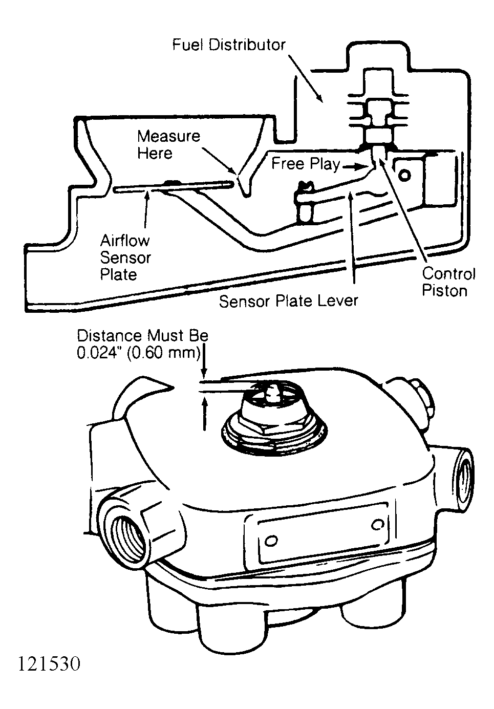 - If free play clearance is incorrect, remove fuel distributor. Check basic adjustment of sensor plate lever. See SENSOR PLATE LEVER ADJUSTMENT heading below. Recheck free play clearance. If free play clearance is still incorrect, adjust sensor plate clearance with control piston stop screw.