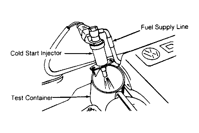 2. Remove and jumper ignition coil secondary wire to ground. Attach metal housing of cold start valve to ground. Direct cold start valve injector into a clean container. See Fig 1 . Have assistant turn ignition switch to START position and observe cold start valve spray pattern.