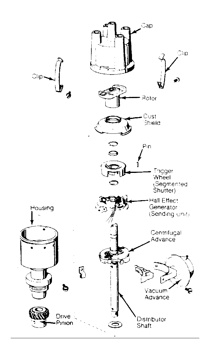 - Remove retaining snap ring. Carefully pry off trigger wheel. Remove washers. Remove screws and lift out Hall sending unit and connecting socket. Remove base plate and vacuum unit. Remove pin and distributor drive pinion and shims.