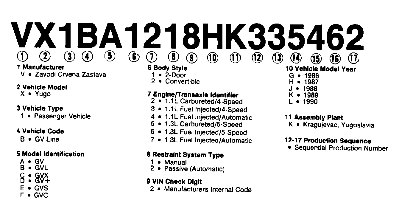 Home >> Yugo >> 1988 >> GVL >> Repair and Diagnosis >> Engine Performance >> Application >> Engine/VIN Id >> Model Identification >> Notes